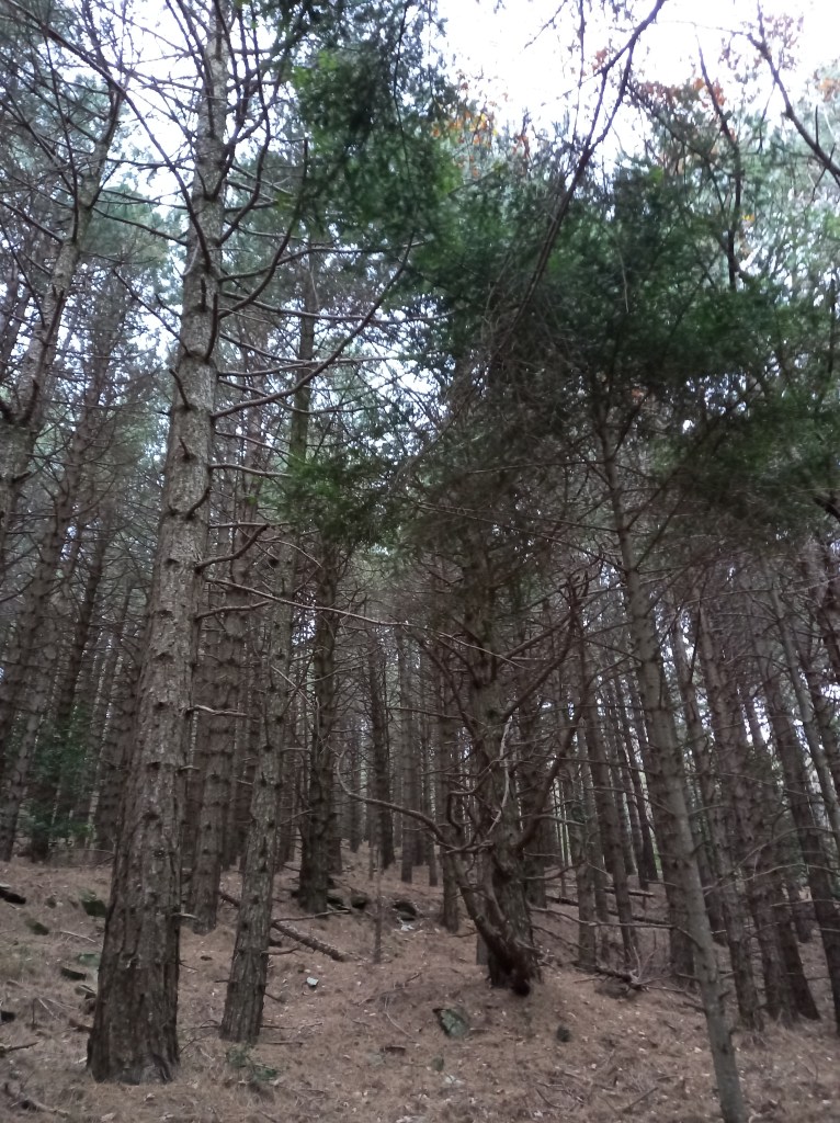 Il tratto pianeggiante, lascia il posto ad un versante molto acclive, dove è presente una foresta di pino nero, anche questa piantumata negli anni 30/40 dove insistevano delle zone prative.