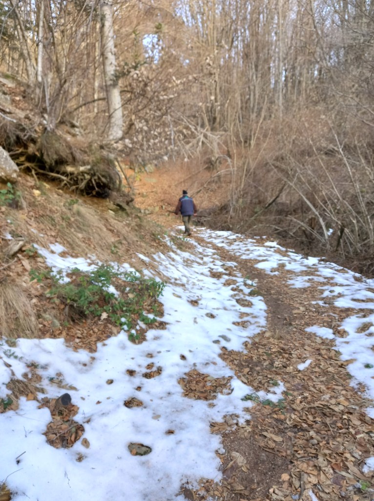 Lasciamo l’auto al bivio per le Casermette e imbocchiamo la stradina opposta, quella de Prie de Berlando, la nevicata della settimana scorsa, ha lasciato dei residui di neve nelle zone in ombra e umide,.