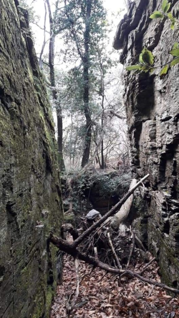 Da questo gigantesco monolito, chissà quando, si è staccata un enorme porzione di roccia, di forma perfettamente rettangolare, che è scivolata per una decina di metri verso valle, formando in questo modo, un’ambiente che lascia sbalorditi per il suo regolare perimetro, fa subito pensare ad un’opera umana, visto la linearità delle pareti, che delimitano questo anfratto.