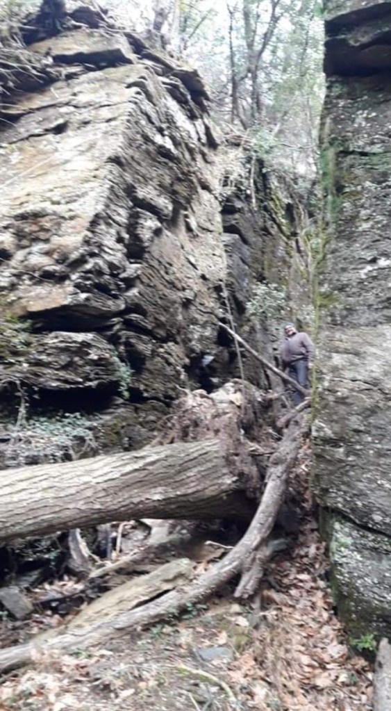 Piero mi guida verso l’entrata della Giescia dei Tanizzi, superando ancora un’ultima pianta sradicata, ci si trova all’interno di una grande spianata di forma rettangolare, con diverse piante cresciute aggrappate alle rocce, con un piccolissimo strato di terra per l’apparato radicale.