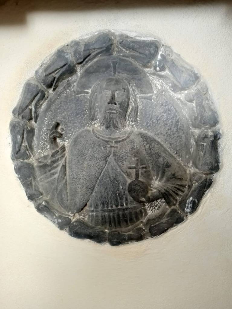 In una parete della sacrestia, l’effige di Gesù Cristo in stile o d’epoca bizantina, scolpita in una formella di ardesia forse l’oggetto più antico di questa Chiesa.