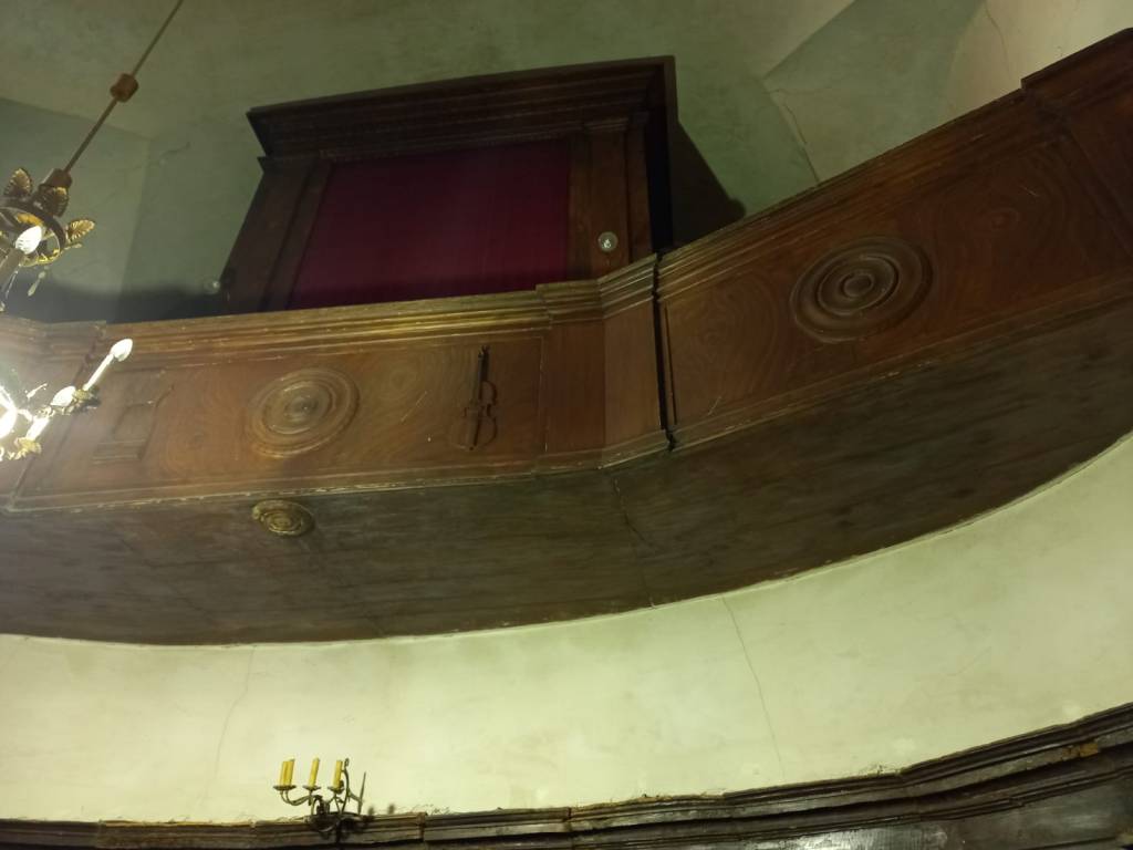 Un soppalco superiore, segue l’andamento a semicerchio del coro e alloggia l’Organo Agati Nicomede del 1866, nella formella centrale, della balaustra, ,fanno bella mostra due sculture in legno raffiguranti una lira e un violino.