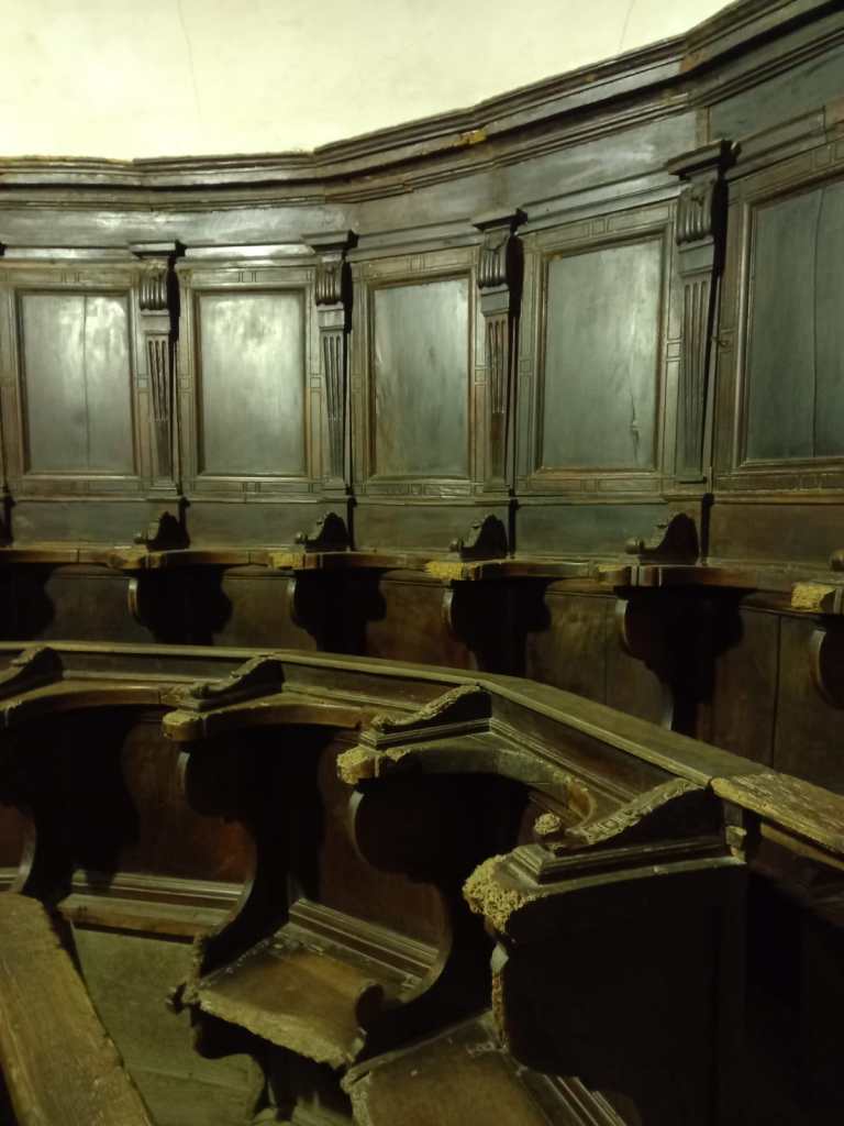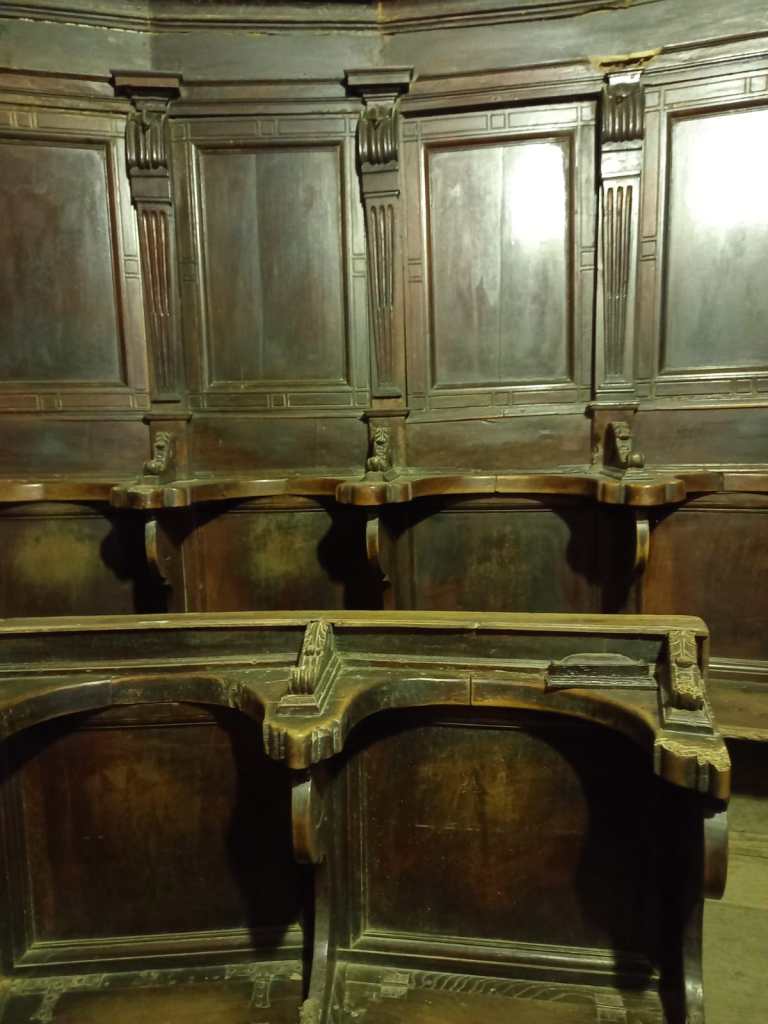 Chiedo a Don paolo, se è possibile visitare gli interni della Chiesa e così passando dalla sacrestia, sono al cospetto di una delle meraviglie di questa Chiesa, il Coro Ligneo, un pregevole manufatto in legno del 1700, in stile barocco.