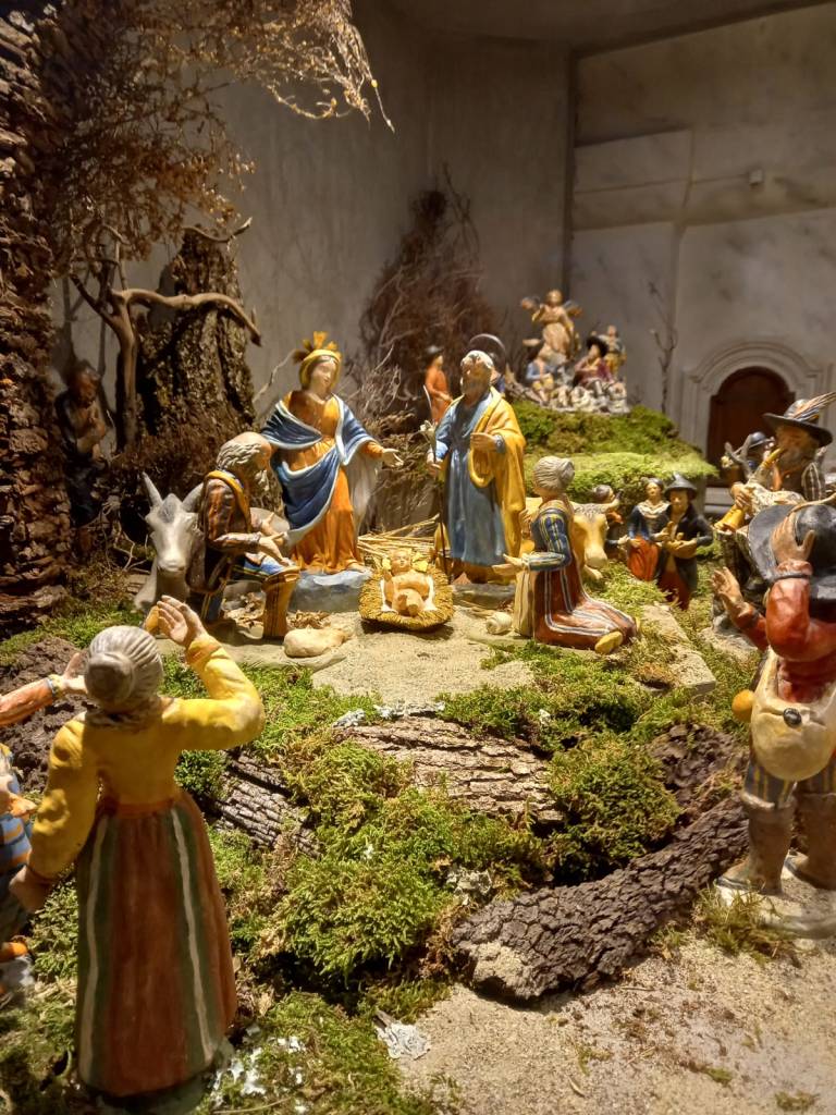 Accende la luce della teca, ed eccole le statuine, tutte disposte in un bel presepe di campagna, in uno spettacolo di colori, che esaltano i particolari, di pregevole fattura, molto curati dei loro vestiti, in voga nell’ottocento.
