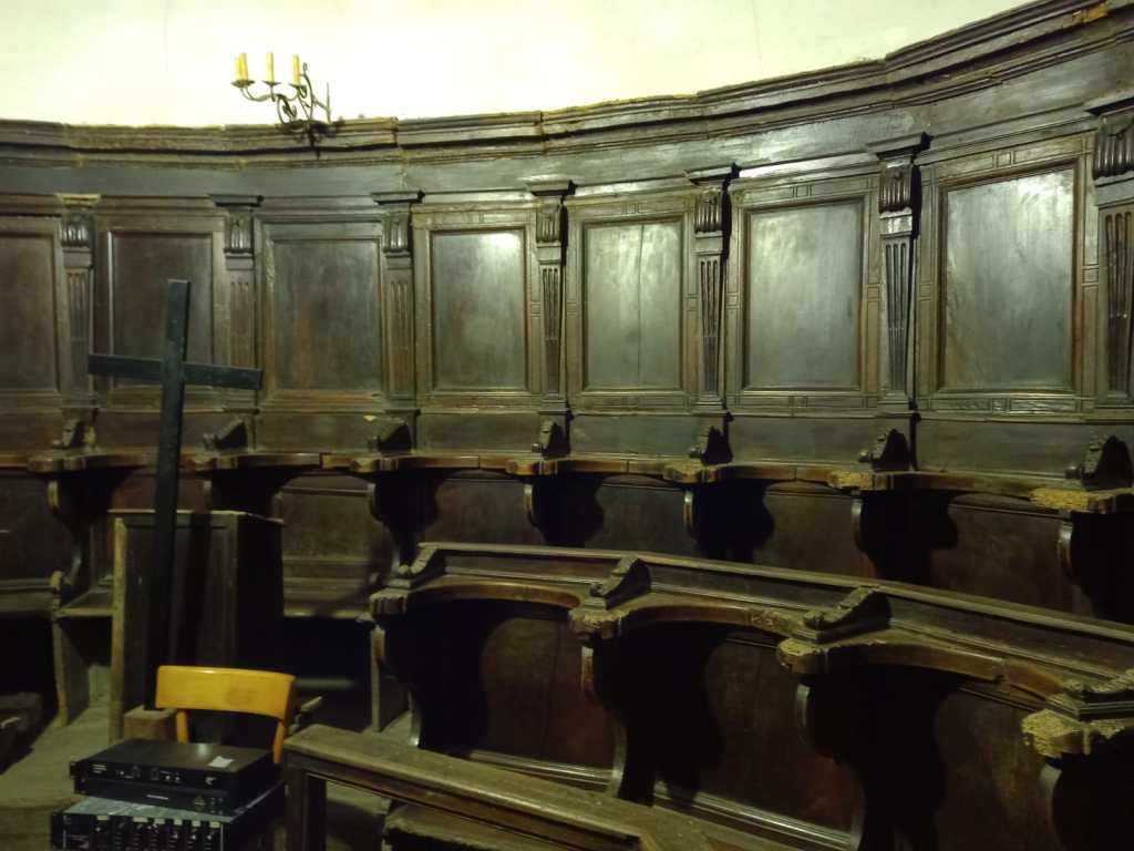 I posti a sedere sono alloggiati in due semicerchi, questa predisposizione sembra rispecchiare la gerarchia monastica, negli stalli, con schienali, stavano i monaci, mentre i conversi sedevano nel corpo avanzato del coro.