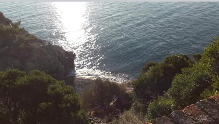Sotto di noi, la bella insenatura con la grotta di Napoleone e una deliziosa spiaggetta, l’accesso è vietato perchè di servizio per uno stabilimento balneare.