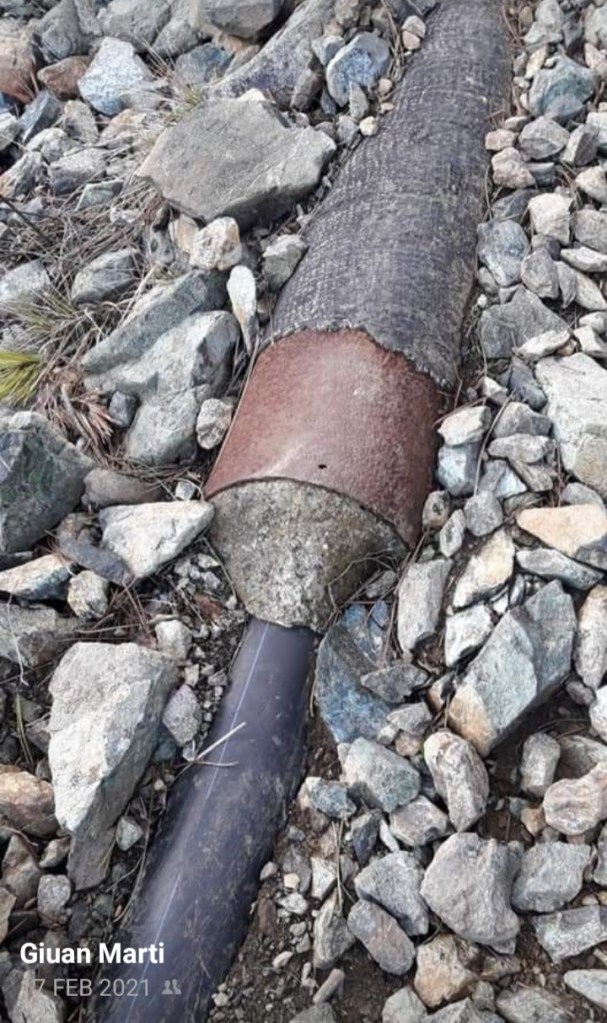 Ai piedi di questa costruzione, la stradina che conduce al passo del Muraglione con il tubo in polietilene inserito nella ex tubazione in acciaio.