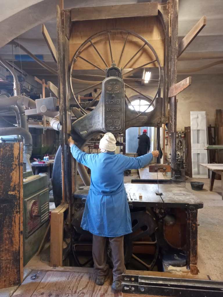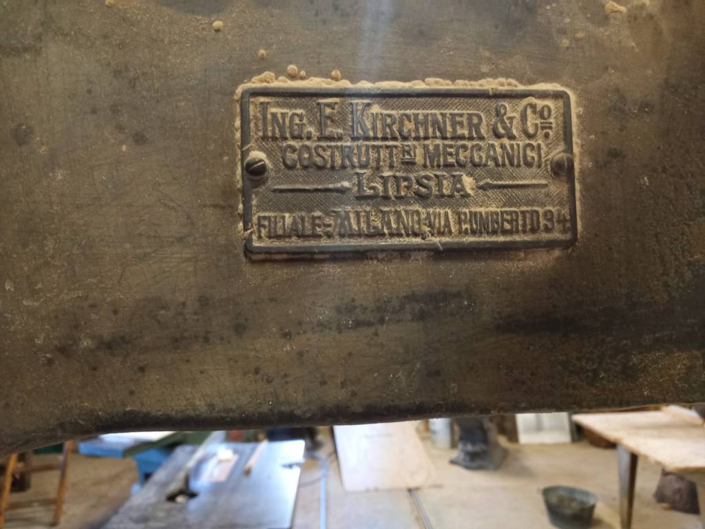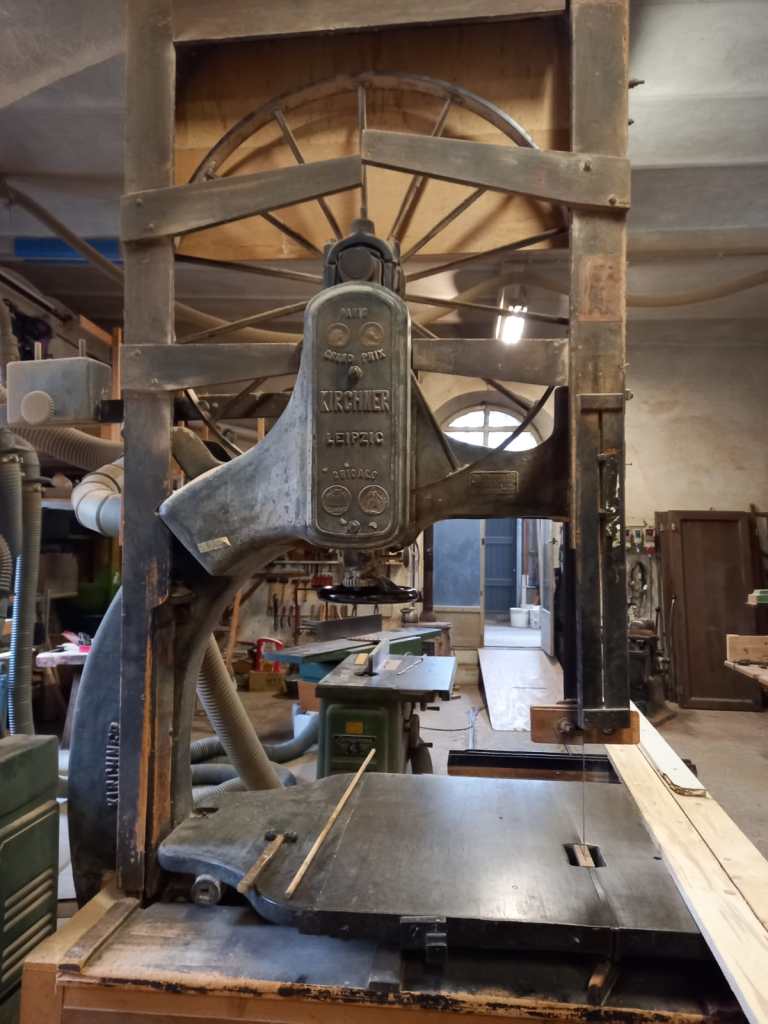 Troneggia al centro della falegnameria una grande sega Kirchner a nastro con carrello fabbricata a Lipsia nel 1912 il piano misura 120 cm!