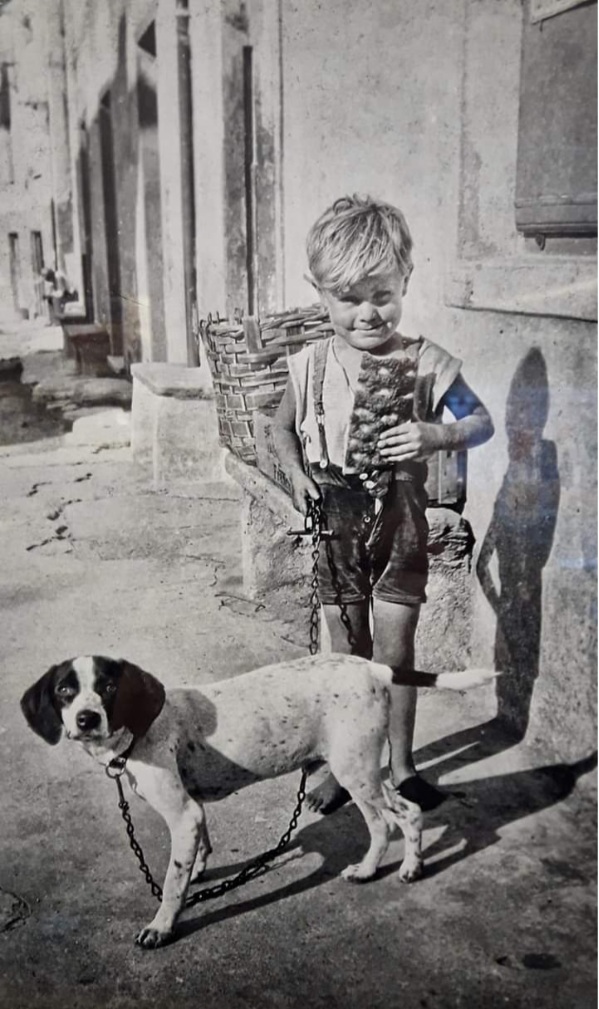In tu Pasciu, a ghe sempre steta na bitega du pan.In sta fotu di anni 30, un figgio’ cuntentu, cun un cagnettu, sligo’ da so cadena e cun un belu toccu de figassa in man! Au barcun da bitega g’han missu u scuu. Dere’ au figgio’ ghe na corba pe u pan e na cascetta pe a verdua. In tu mesu de sta bela fotu, l ‘umbra du mattatoiu, che u nu ghe ciu’.In fundu u ghe n’ommu, seto’ in se na posa a piggiou u su, du doppupransu, in te un postu che ou ciamma u Ciou.