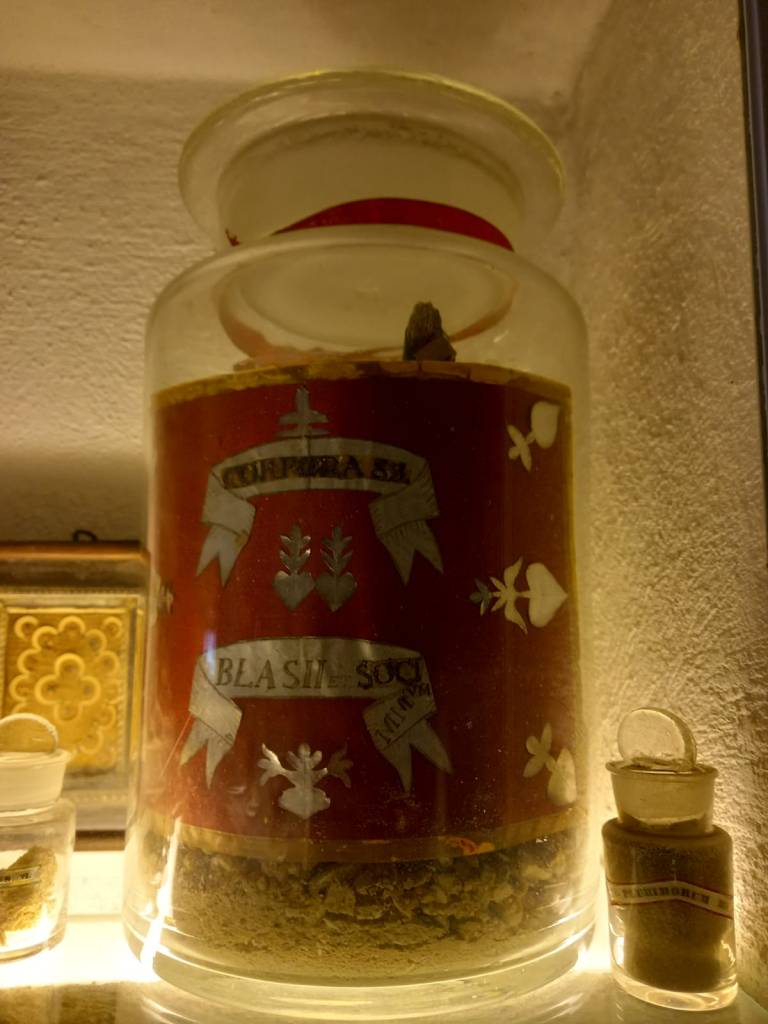 In una grande teca, sono esposte le reliquie di Santi. I resti dei frati, che furono seppelliti nell’Eremo, sono contenute in recipienti di vetro.