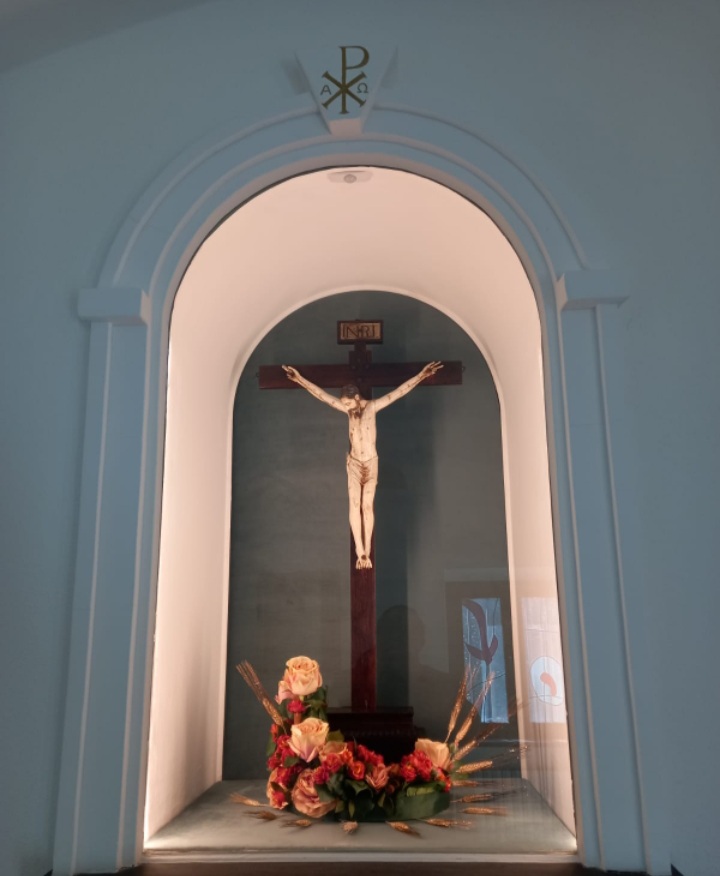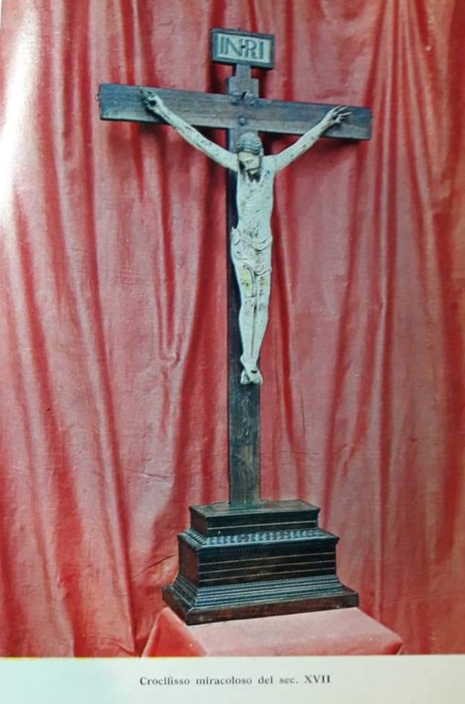 Questo crocifisso, in avorio, ha una storia importante, fu acquistato nel 1641, da un cavaliere portoghese a Goa in India, la nave che lo conduceva in patria fu attaccata dai pirati turchi, che lo condussero prigioniero ad Algeri, il crocifisso fu posto in una piazza per essere distrutto.