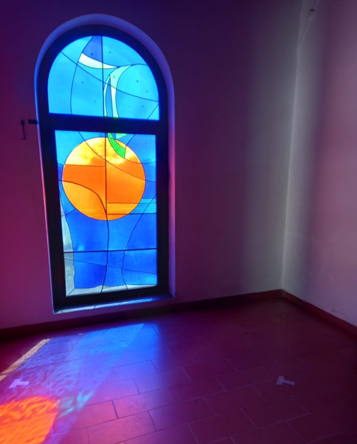 Una porta vetrata, immette nel grande chiostro interno alle mura, con una bella vista delle vicine alture che circondano l’Eremo.