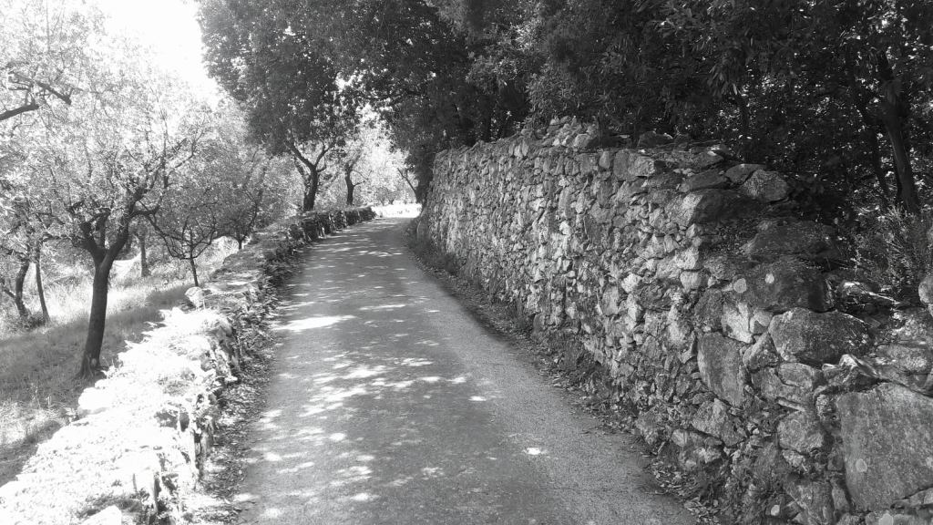 La via Bianca, è un bel itinerario, escursionistico/storico. Il percorso, abbastanza ripido, è da percorrere preferibilmente, nelle belle giornate in inverno/primavera. Si parte dal sciu da Teiru, dai Muinetti dove arrivava l’acqua del beo da Besestra, che faceva ruotare dei mulini per cereali. Si imbocca il primo tratto scalinato, della via Bianca e si arriva alla prima cinta muraria, con le colonne delle vigne cistercensi, salendo si incontra la colonna da Porta Russa da dove scendeva una strada verso il sciu da Teiru. Salendo ancora siamo nella località a Sigaa, qua nei due tratti in piano ci sono le due edicole votive, u nicciu di Fricciuin e quello da Cianna Via, questo toponimo si riferisce al terrapieno, che è stato costruito, in questo punto, per superare un avvallamento, qui la vista spazia verso a Servega valle dell’Arzocco. Proseguendo si deve fare una sosta sul sagrato della Chiesa di S.Caterina delle Ruote, dove sopra il portale è infissa una pietra d’inciampo, la lapide dei fratelli Accinelli e Piombo, deportati e morti in un campo di sterminio. Il percorso è sempre in salita, nei pressi della Casa Torre è bene non transitare nelle ore notturne…. in questa zona, le streghe ballano intorno al fuoco! Qui nelle belle giornate, si ha un’incomparabile vista di tutta la nostra città, con il mare a far da sfondo. In questo tratto di strada, ben visibile il tipico lastrico della strada romana. Si arriva così alla Chiesa del Beato Jacopo. Un sentiero alla nostra destra, ci conduce in cinque minuti, sulla cima del Muntadò, dove sono ancora visibili, le opere militari della seconda guerra mondiale. Il sentiero pianeggiante che si diparte al disotto della strada cementata che arriva alla Chiesa, è la continuazione della via Bianca, dopo una curva e una salitella, si arriva ad intersecare la strada tagliafuoco della Madonna della Guardia. Stranamente nella stradina, che abbiamo appena percorso, non esiste traccia del sedime, come quello, ancora ben conservato della via Bianca, probabilmente le pietre sono state prelevate e utilizzate per la costruzione della Chiesa del Beato Jacopo. In questa zona oramai completamente interrato c’è l’attraversamento del Beo de Gambin, altra grande opera idrica, l’acqua prelevata dal Rio Gambin, al disotto dell’abitato delle Faje, regimentata in un canale, passava sopra u Muagiun, arrivava, dove ora c’è la discarica della Ramognina, poi verso l’Arenon, per finire nella valle dell’Arzocco, qui nei pressi della Lapide di Negri, il canale è ancora visibile, arriva da Ca de Toe e finiva per conferire l’acqua delle Faje, nell’invaso della diga Ferruginosa, una diramazione irrigava gli orti du Caregà. Se si vuol fare un pò di ricerca storica, si può proseguire, lungo le pendici dell’Arenon e dopo un falsopiano prativo, cercare la continuazione della strada romana, in direzione di Costata/ Isola del Deserto, la strada oggi è diventata uno scolo d’acqua e il suo sedime è stato divelto da man d’ommu e impilato ai lati dell’ex strada romana. Oppure, raggiunta la strada tagliafuoco, arrivando dalla stradina che parte dal Beato Jacopo, svoltando a destra, si va verso la Madonna della Guardia. A questo punto, un’itinerario alternativo è quello che, con una deviazione a sinistra, nei pressi da Sbaraggia da Pustetta, arriva a Ca de Sevisse ( prima di arrivare alle Sevisse leggere la sua storia) poi si può scendere, se il sentiero è ancora percorribile, verso a Ciusa du Spurtigio’ arrivati allo sbarramento, si segue il sentiero, che corre parallelo.al beo, verso l’Invrea, a metà del percorso, sono da visitare, alcune postazioni di artiglieria, della seconda guerra mondiale.