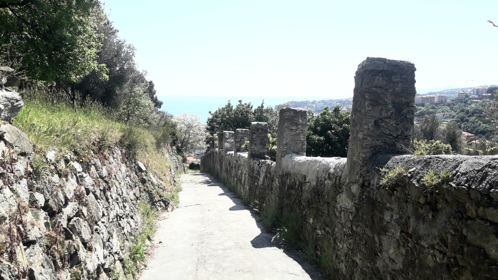 Percorrendo il tratto finale della via Bianca, già via romana Emilia Scauri, all’inizio del tratto in discesa, si è al cospetto, alla nostra destra, di un imponente muraglia, che delimita la strada, verso il sciu da Teiro, questo grande manufatto, in certi punti largo anche 80 cm, seppur depredato e quasi atterrato delle sue pietre, non lascia alcun dubbio relativo all’imponenza e importanza che aveva quando è stato costruito.
