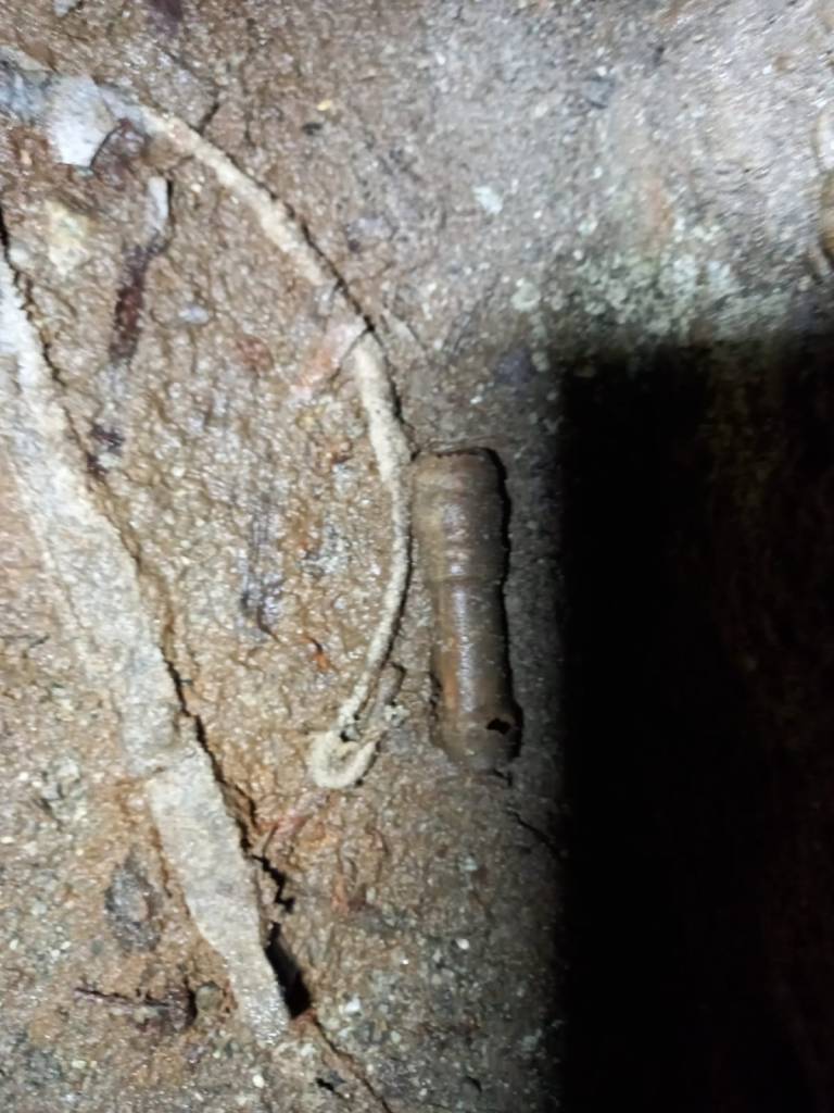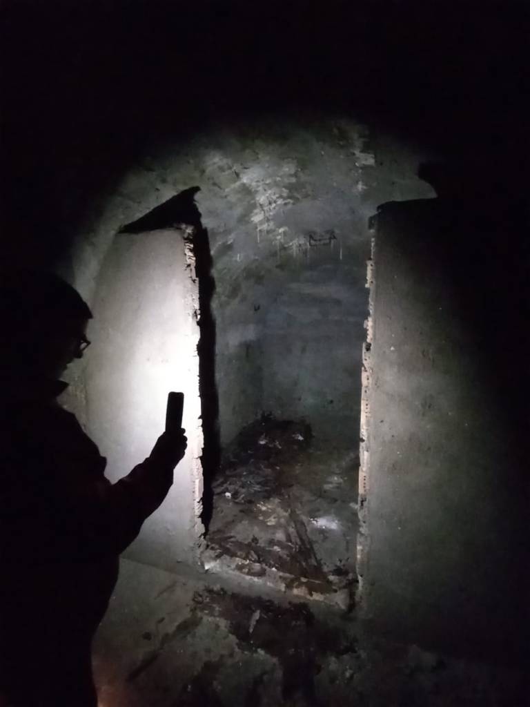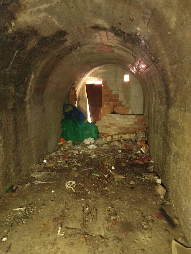 Un grande colmo di terra e pietrume è stata scaricato all’interno del rifugio, tramite quello che era uno sfiato d’aria o un’uscita di emergenza, aggiriamo questo ostacolo, ma fatti pochi passi, un muro in mattoni chiude la galleria.