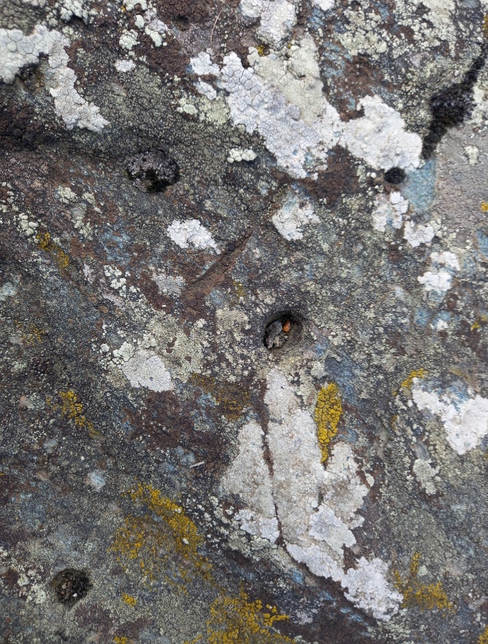 Con Cesco, ci inerpichiamo, sopra un grande masso solitario, che si erge come punto panoramico sulla zona circostante, qui osservando con cura la superfice, completamente ricoperta di licheni, si intravvedono alcune incisioni.