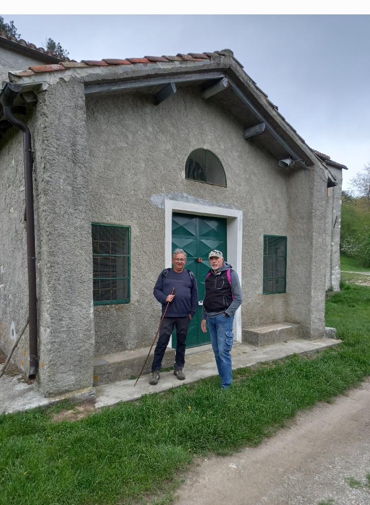 Io Giorgio e Roby, arriviamo a Colla S.Giacomo, dove lasciamo l’auto, questo crocevia, fa parte dei percorsi napoleonici e fa riflettere oggi, con i tuoni di guerra in Europa, leggere la targa dedicata a coloro che su questi bricchi ai primi dell’800 se le diedero di santa ragione.