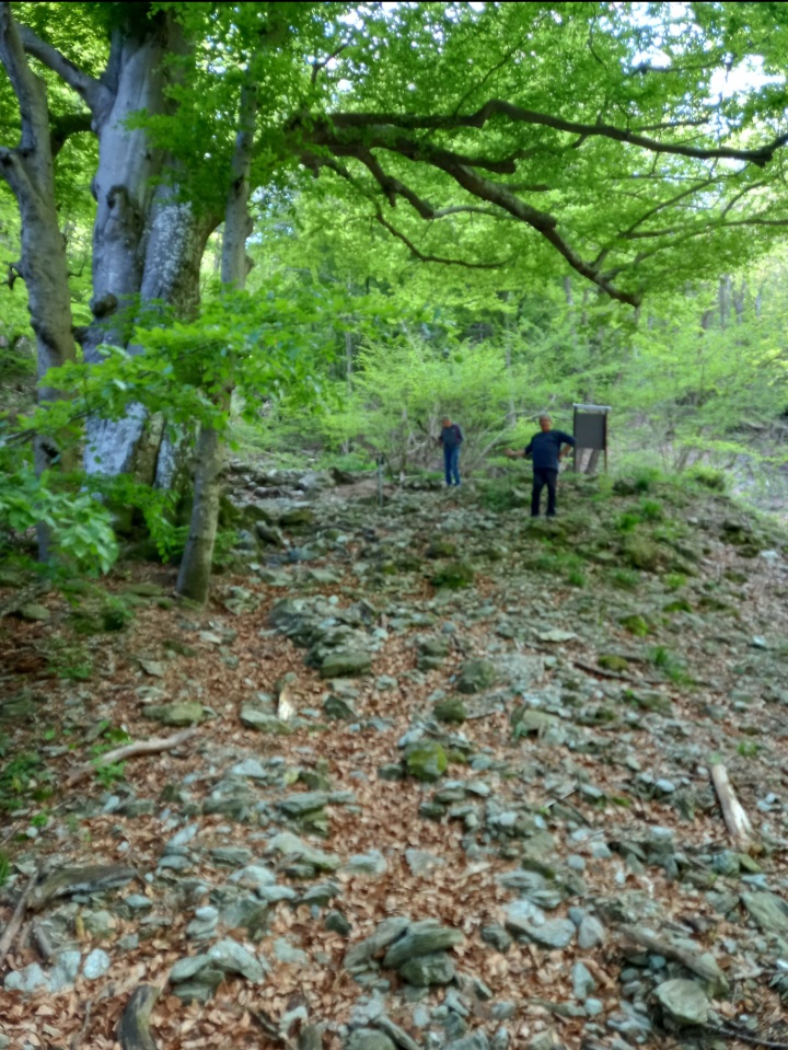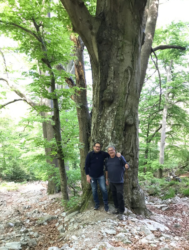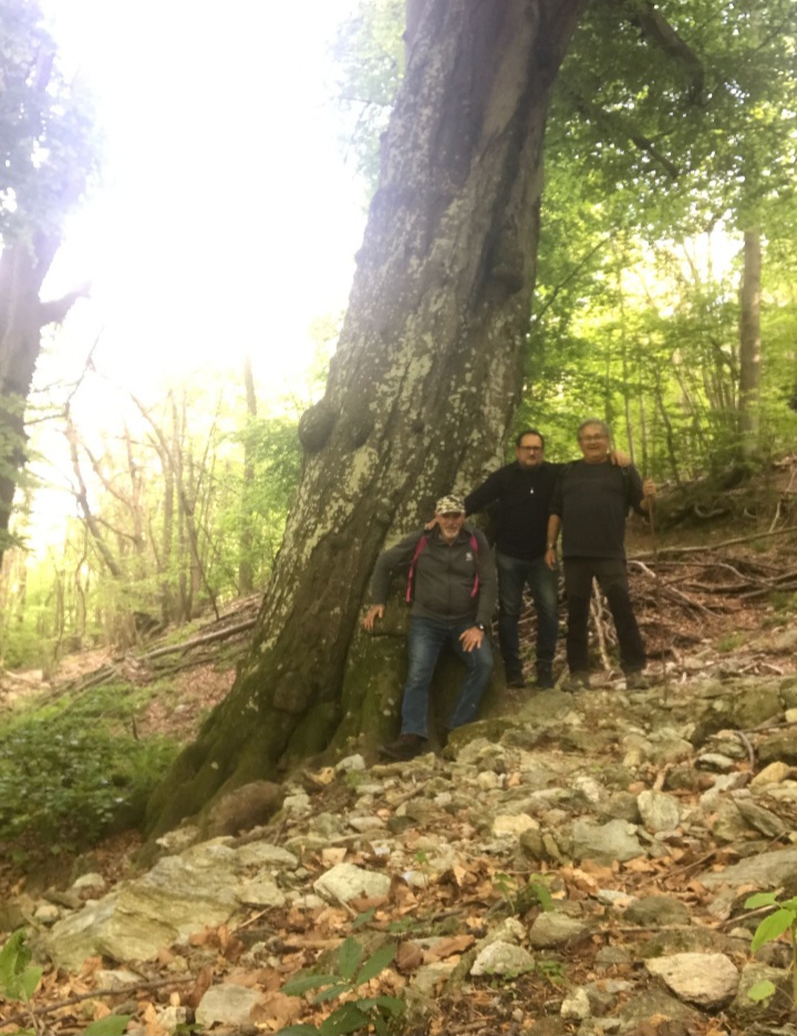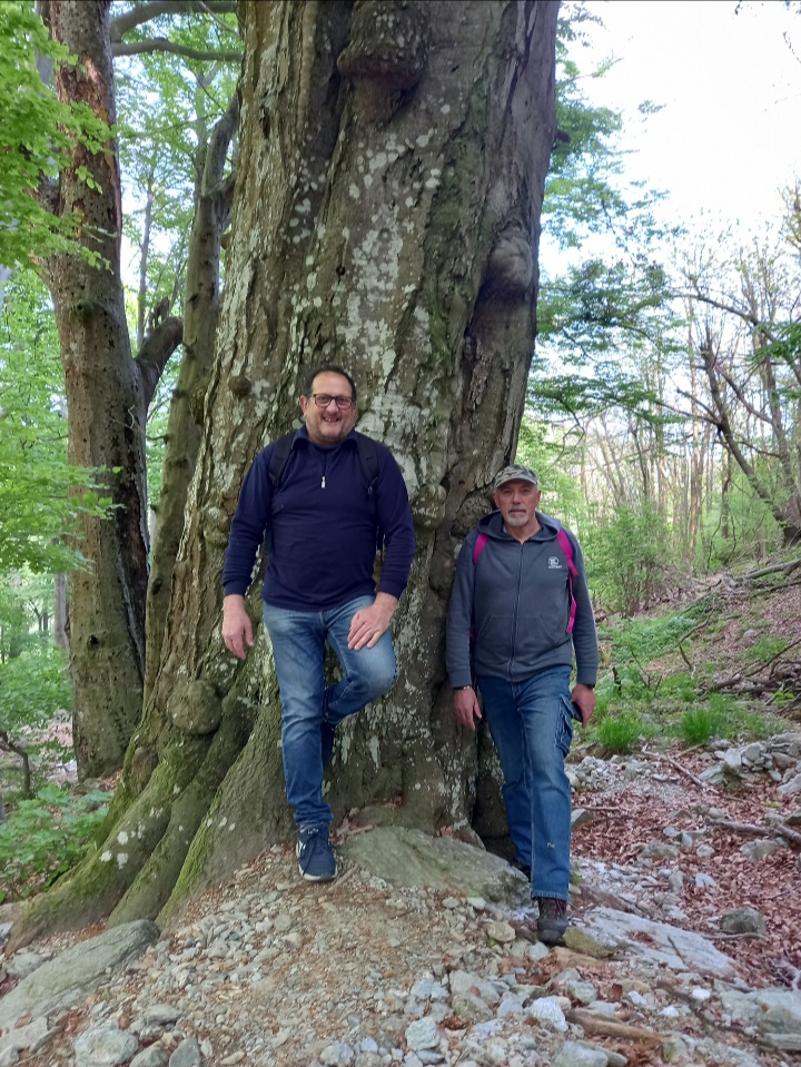 Dopo queste doverose e seriose riflessioni, io Giorgio e Roby, proseguiamo verso i Fo di Benevento, raggiungibili con uno sterrato, fra boschi misti con antiche carbunee, sotto il fruscio delle pale eoliche