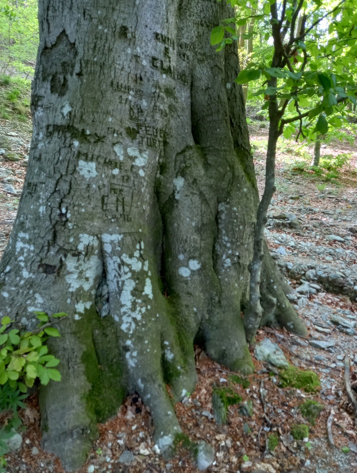 La corteccia liscia dei faggi da sempre è fatta oggetto di incisioni, nomi, date simboli ecc.