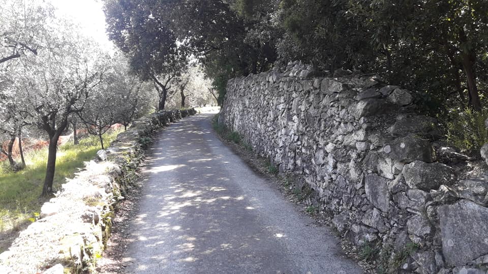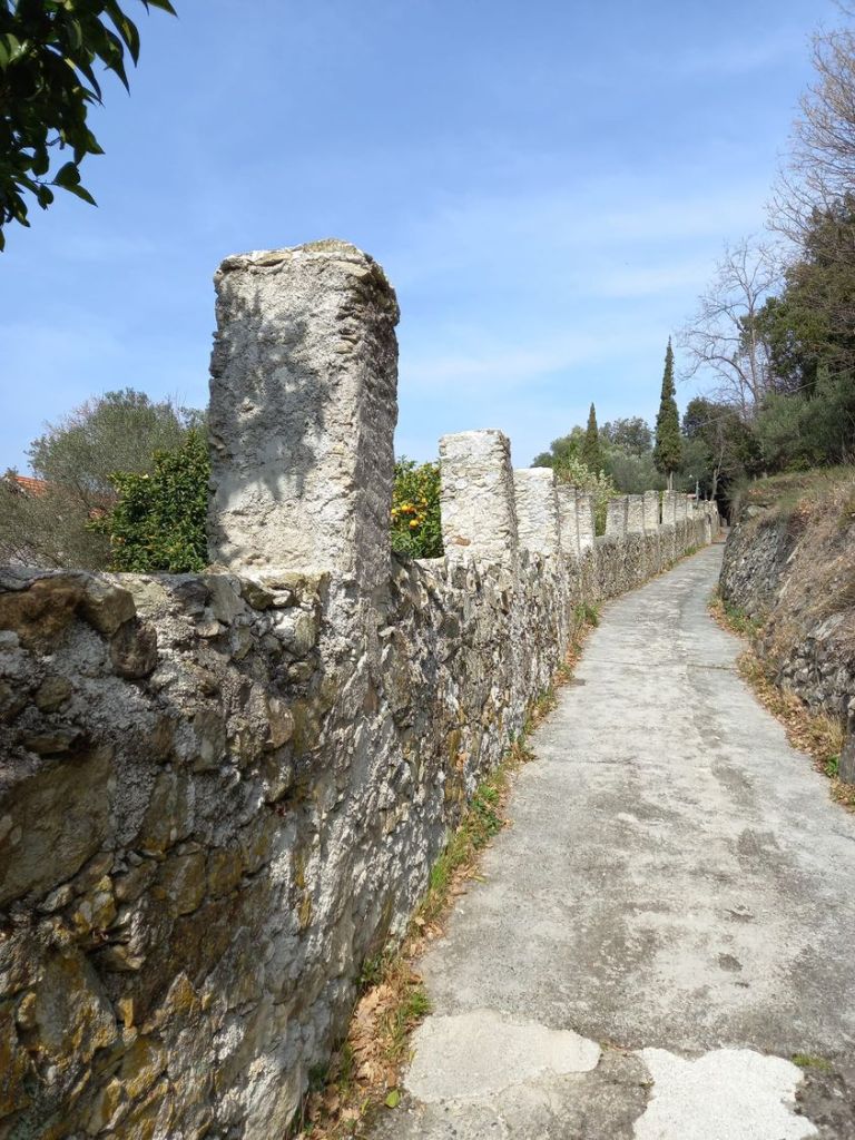 A via Gianca continua per poi arrivare sotto agli ersci da Sigaa e con l’imponente muro di delimitazione, costruito a scopo difensivo del Castrum Romano del Parasio, ancora in discesa, passa accanto alla vigna cistercense, dau Buntempu e arriva ai Muinetti e a Vase