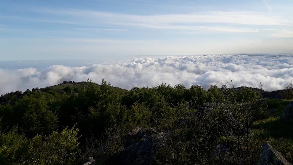 Al culmine della salita si arriva ad un pianoro, dove ci accorgiamo di essere in casa d’altri… qua sono presenti molte lettiere e pasture, di un grande branco di ungulati, che hanno anche a disposizione na smoggia per i fanghi e na vinvagna per le abluzioni, bello il panorama dalle rocce con il mare di nuvole.