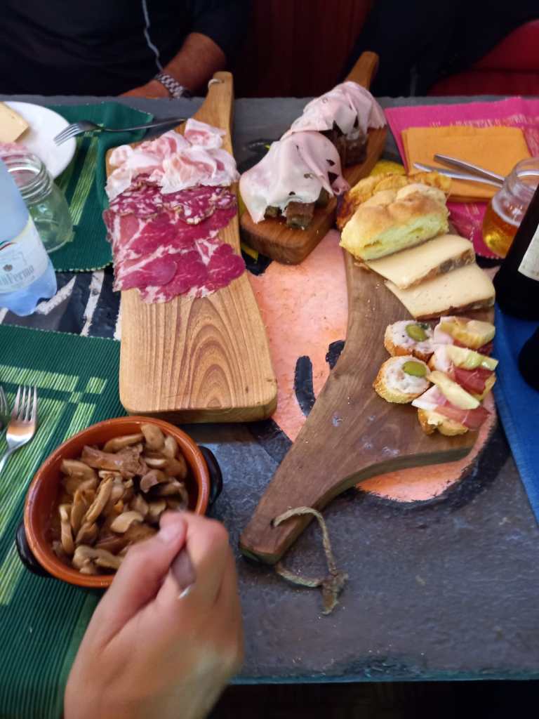 Per fortuna, dopo pochi minuti, siamo avvisati di quattro posti miracolosamente, disponibili, possiamo finalmente sedersi e aggredire, i taglieri di salumi misti con formaggio, funghi, focaccia e cipollotti.