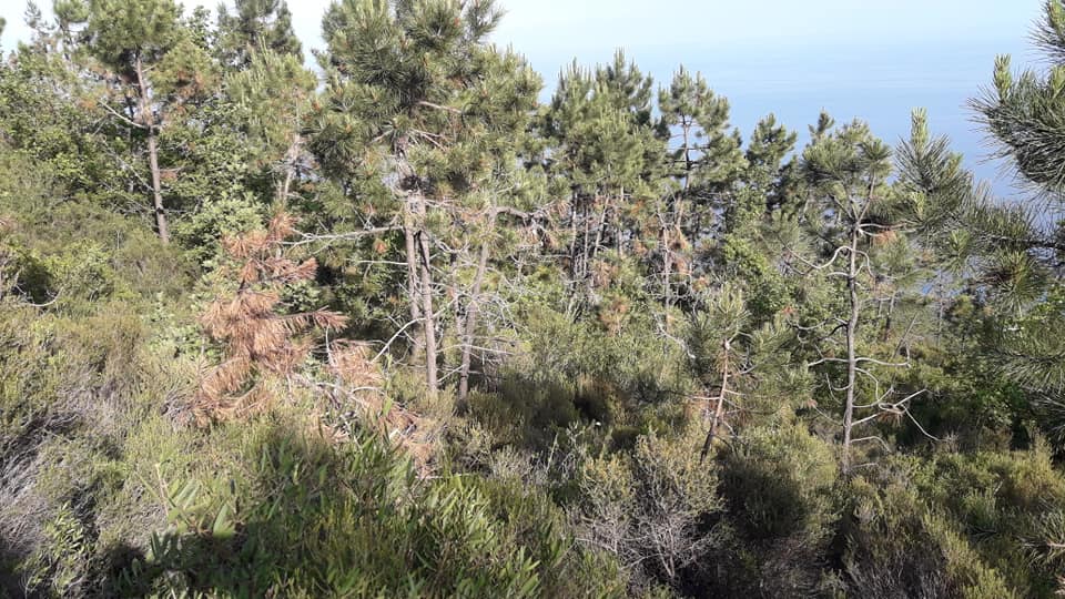 Seguiamo il sentiero, fino a che la vegetazione ne occlude la vista, decidiamo di dividerci per continuare la salita, ma è quasi impossibile avanzare, fra le eriche, il lentisco, rovi, ginestra e alberelli di pino, bisogna fare attenzione anche alle profonde buche scavate dall’acqua, che nascoste dalla vegetazione rappresentano un pericolo.