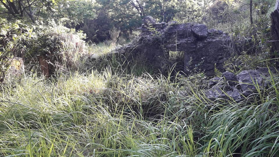 Seguiamo l’andamento di un terrazzamento e nei pressi di una crosa, ritroviamo un tratto di tubazione, che ci indica ancora una volta, la direzione dove trovare a Vinvagna di Funtanin, ma anche un’enorme groviglio di rovi al cui interno si cela la fonte e molto probabilmente una vasca di raccolta dell’acqua, da dove si dipartiva la tubazione che poi arrivava al Cian du Tunnu.