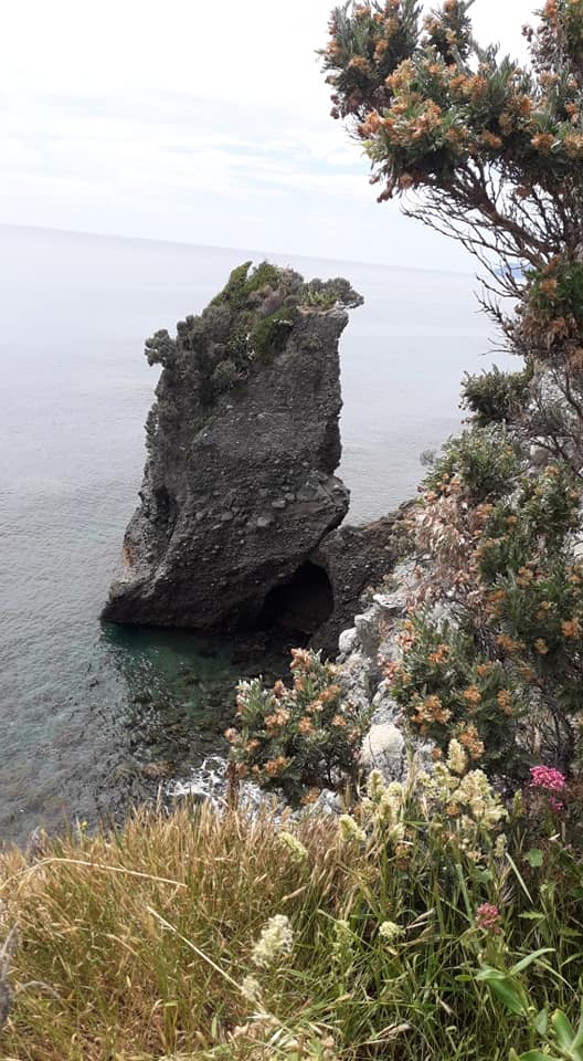 Grandi blocchi di conglomerato sembrano emergere dal mare sono i cosiddetti detti faraglioni di Celle