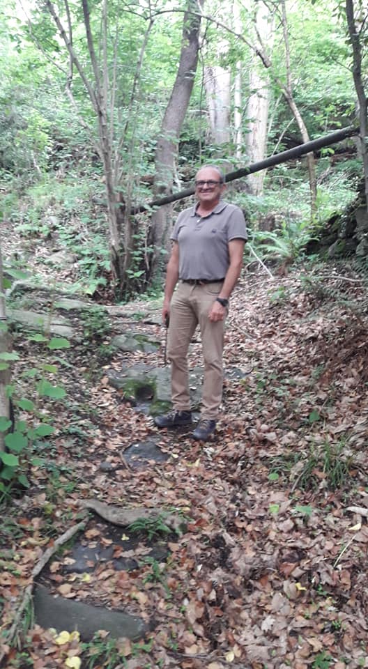 Passiamo accanto alla Apicultura Montali, dove incontriamo il proprietario, Enrico Dabove, un cugino di mio papà, si parla di questa antica strada e di una diramazione, che sale fino alla località di Bin, ci rassicura della praticabilità della strada, perché ha provveduto lui stesso insieme ad altri al taglio dei vegetali, che ne impedivano il transito, sveliamo il perché della nostra escursione e anche lui conferma il mistero di questa strana pietra.