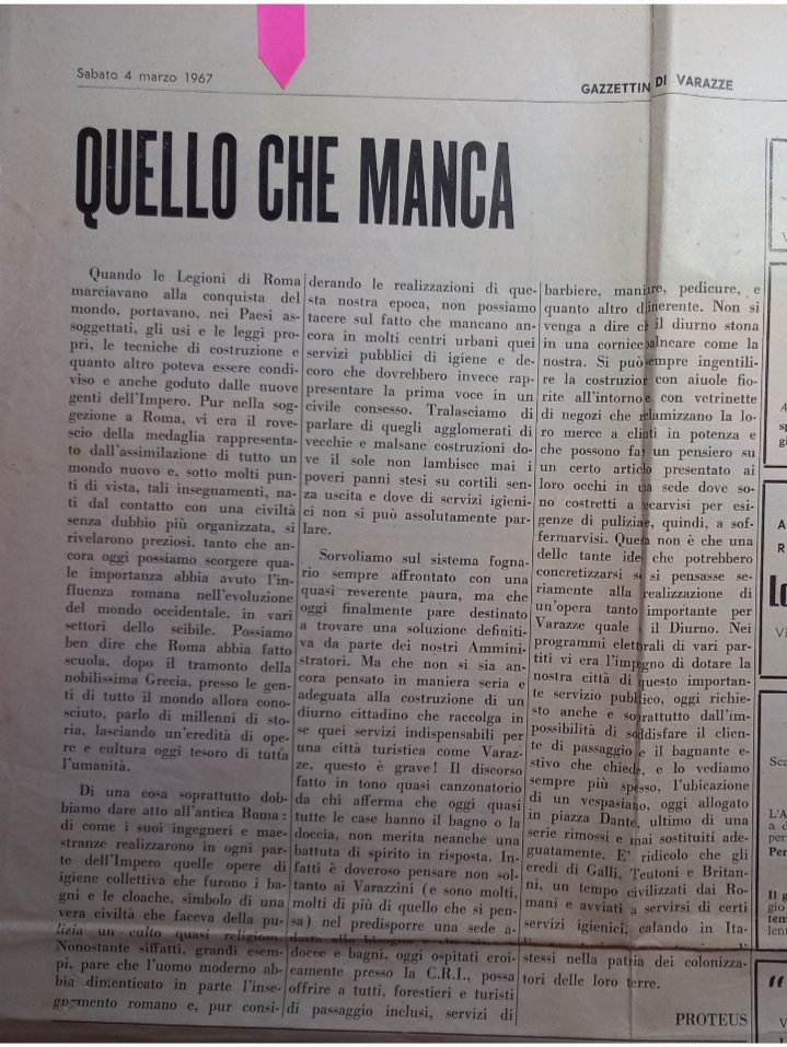 Di una cosa soprattutto dobbiamo dare atto all’antica Roma di come i suoi ingegneri e maestranze, realizzarono in ogni parte dell’Impero quelle opere di igiene collettiva che furono i bagni e le cloache, simbolo di una vera civiltà che faceva delle pulizia un culto quasi religioso………ma l’uomo moderno ha dimenticato in parte l’insegnamento romano…….non possiamo tacere sul fatto che mancano ancora in molti centri urbani quei servizi pubblici e di igiene e decoro che dovrebbero invece rappresentare la prima voce in un civile consesso……ma che non si sia mai ancora pensato in maniera seria e adeguata alla costruzione di un diurno cittadino che raccolga in se, quei servizi indispensabili per una citta turistica come Varazze, questo è grave!………Infatti è doveroso pensare non soltanto ai varazzini, nel predisporre una sede adatta alla bisogna e che oltre a docce e bagni oggi ospitati eroicamente presso la C.R.I. possa offrire a tutti forestieri e turisti di passaggio inclusi servizi di barbiere, manicure, pedicure e quanto altro di inerente…….si può sempre ingentilire la costruzione con aiuole fiorite…..con vetrinette di negozi che reclamizzino la loro merce………………..Questa non è che una delle tante idee che potrebbero concretizzarsi se si pensasse seriamente alla realizzazione di un’opera tanto importante per Varazze quale è il diurno. Nei programmi elettorali di vari partiti vi era l’impegno di dotare la nostra città di questo importante servizio pubblico…………