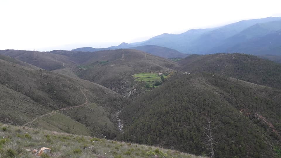 Qui la vista spazia verso l’entroterra e il gruppo del Beigua, sotto di noi la strada di S.Giacomo verso Costata, con l’enorme ferita dello smottamento di Bric Berlese.