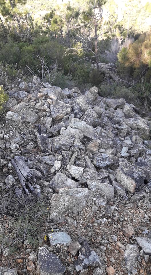Arrivati all’apice del Muntadò poco prima di questi ingenti residui militari, incuriosisce un Muggiu de Prie, chiaramente non appartenente ai manufatti sopra citati, ma da cui sono state prelevate le pietre per essere utilizzate nella fortificazione di questo bricco.