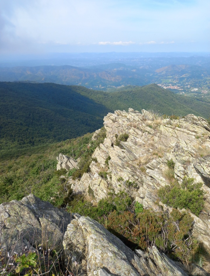 Il pianoro, degrada verso Sassello, la cresta rocciosa presenta uno strapiombo a picco sul verde sottostante.