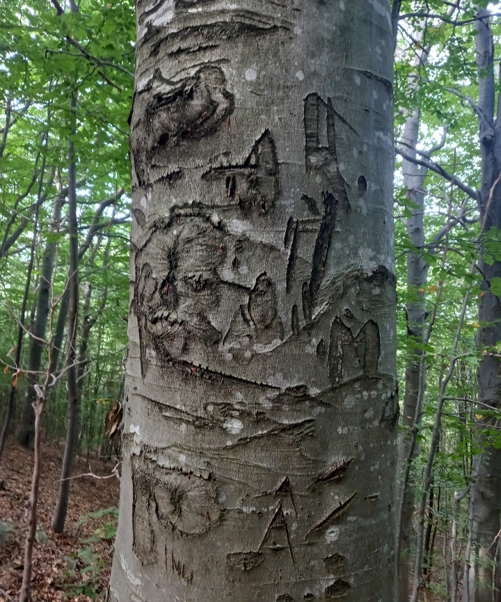 Tutti i tronchi dei faggi a bordo strada, sono segnati da vistose incisioni, lettere, numeri e simboli, divenuti con il tempo indecifrabili, distorte cicatrici sulla loro corteccia.