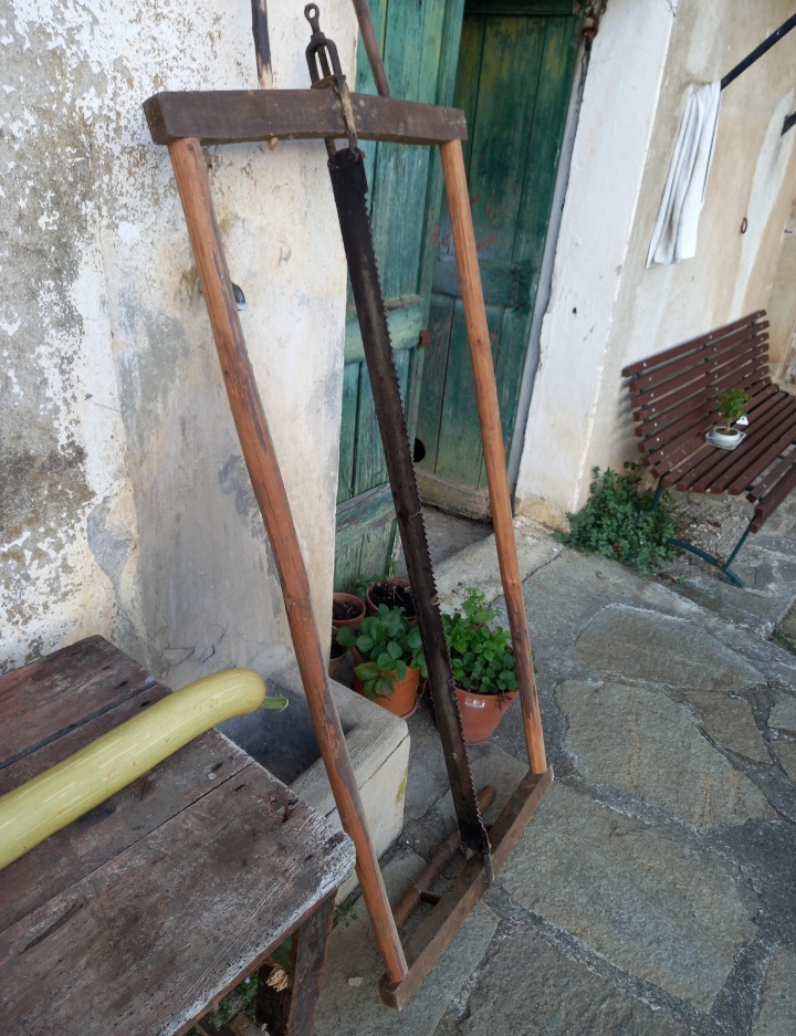 Appesa ad una pareta, fa bella mostra una Ressia, come quella adoperata dai Arsioi du Lurbascu, i segantini, che dal Biun, tronco, posato sopra u Bancà d’Arsiou, un cavalletto, lavorando in coppia ricavavano le assi e le traversine per la ferrovia.