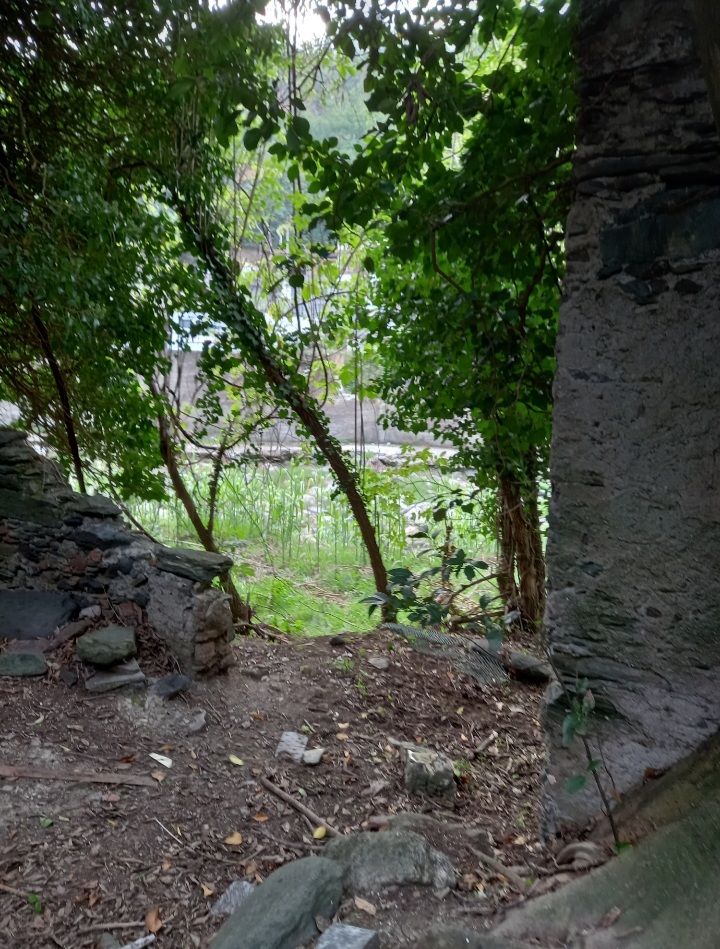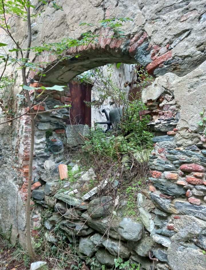 Si passa davanti a Savunea, anche lei conquistata dai rampicanti, la foto è degli anni 90, quando in questo opificio esercitavano l’attività di marmisti, i fratelli Regnasco