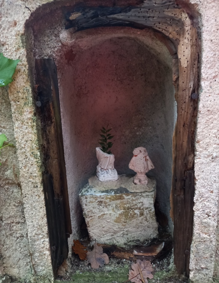 Nella nicchia due statuette mozzate, forse una della Madonna e l’altra del Bambin di Praga
