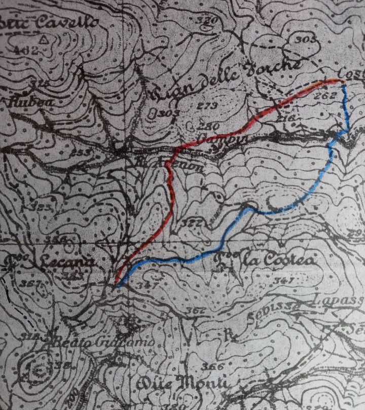 Nella Cartina sono evidenziati i due percorsi, in rosso la viabilità che saliva lungo le pendici del Bric Arenon, meno impegnativa di quella in blu, il percorso individuato dal Rocca che saliva lungo u Briccu di Gruppi.