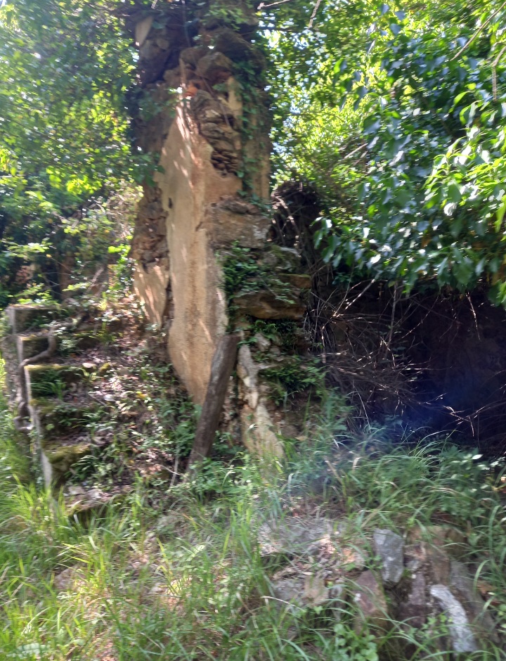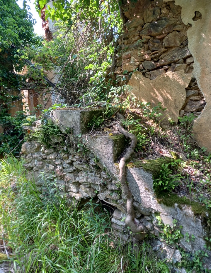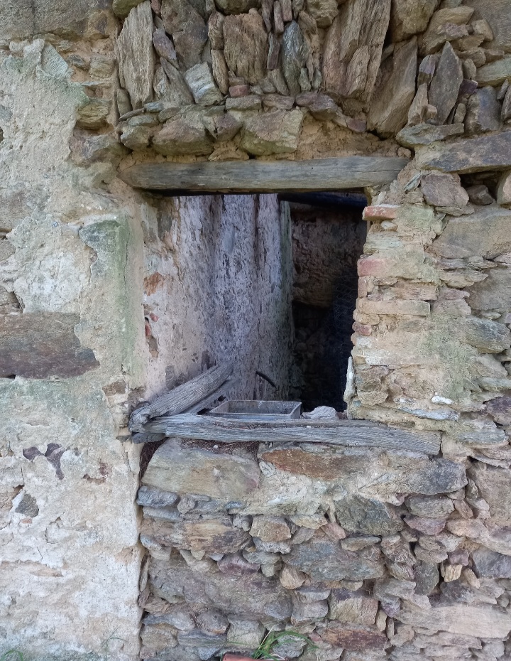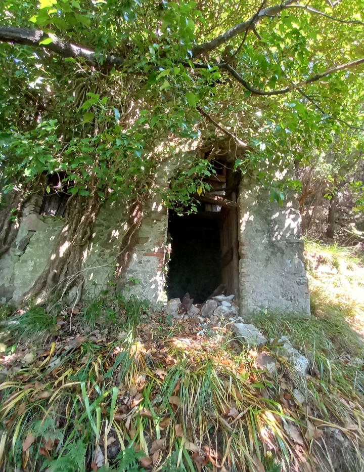 Si incontra a sinistra un Seccou per castagne e poi, quando si entra in un bosco di castagne alla nostra destra, avvinta dall’edera e semidiroccata, appare una grande casa colonica.