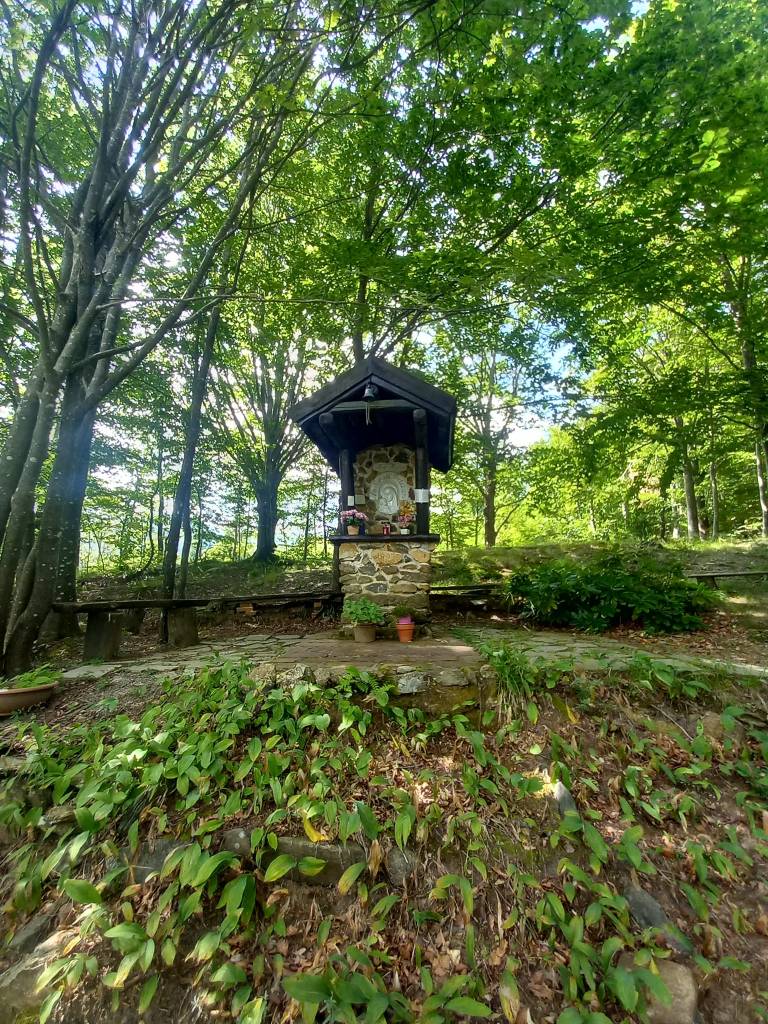 Sono i tempi di guerra, settembre 1944: i boschi dei nostri monti, alle falde del Beigua, sono un rifugio sicuro per i partigiani che trovano nella popolazione aiuto e solidarietà. Spesso però salgono i Tedeschi e San Marco alla ricerca dei loro nascondigli. Siamo in continuo pericolo, stretti tra nemici che usano le nostre case per i loro appostamenti o come loro rifugi. E’ sera quel settembre del 1944. Due soldati tedeschi passano nei nostri boschi per controllare una linea telefonica che collega Sassello con Varazze, passando dal Beigua. Incontrano un gruppo di partigiani. Questi sparano e poi fuggono. Un tedesco viene colpito alle gambe. Non può più camminare. Il suo compagno rimane accanto a lui, solo, per tutta la notte. Qualcuno, nella casa più vicina al bosco, viene avvertito e in un baleno si sparge la notizia. Si pensa subito a come porgere aiuto a quel ferito. Non possono andare gli uomini, è troppo rischioso. Si fanno avanti le nostre mamme. Tre di loro partono con una slitta trainata da una mucca su cui sistemano un materasso, un cuscino, lenzuola e coperte e non dimenticano un po’ di liquore e caffè caldo.Bisogna percorrere qualche chilometro di mulattiera per giungere sulla strada. Il tedesco non ferito, accompagnato dalla giovane maestra del posto, corre attraverso il sentiero nel bosco, a Sassello, per avvertire il comando. La maestra davanti, il tedesco dietro con il mitra spianato, pronto a sparare ad un nuovo probabile incontro con i partigiani. Da Sassello, dove giungono incolumi, parte un’ambulanza: Il ferito può essere trasportato all’ospedale. Tutti ci aspettiamo una rappresaglia: in casi come questi vengono normalmente incendiate tutte le case del paese. Ma… non succede niente di tutto questo: Veniamo poi a sapere che il ferito ha raccomandato di risparmiare quella popolazione che l’ha aiutato e difeso. Le nostre povere case di allora sono così salve. Le nostre madri con i figli in guerra, prigionieri in Germania o sul fronte della lontana Russia, sperano che qualche mano fraterna li accolga e li protegga, che l’odio non prevalga, così come nel loro animo ha prevalso l’amore per “quel nemico” ferito. Si cerca nella Madre di Dio aiuto e protezione. Si fa una promessa a Maria: la costruzione di un’edicola dedicata a Lei. Qualcuno ritorna, qualcuno no. Dopo cinquant’anni, l’edicola è eretta con l’aiuto di molti.