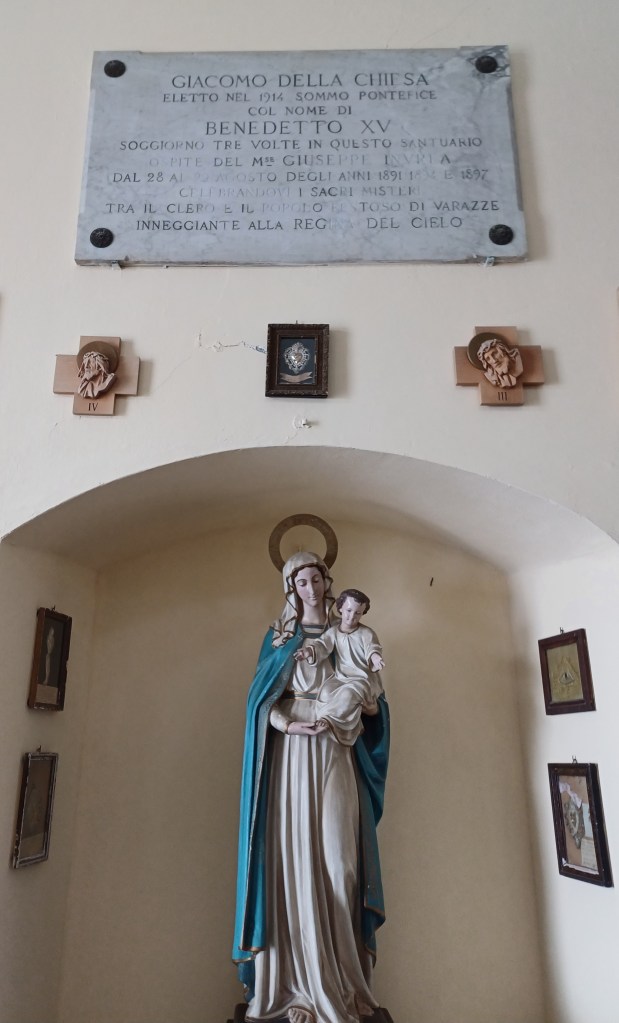 Alcune targhe, sono testimonianze di notevole interesse storico, come quella che ci fa notare Lino, per nulla valorizzata dalla nostra comunità, relativa al papa Benedetto XV, nativo di Genova, che soggiornò per ben tre volte in questo Santuario.