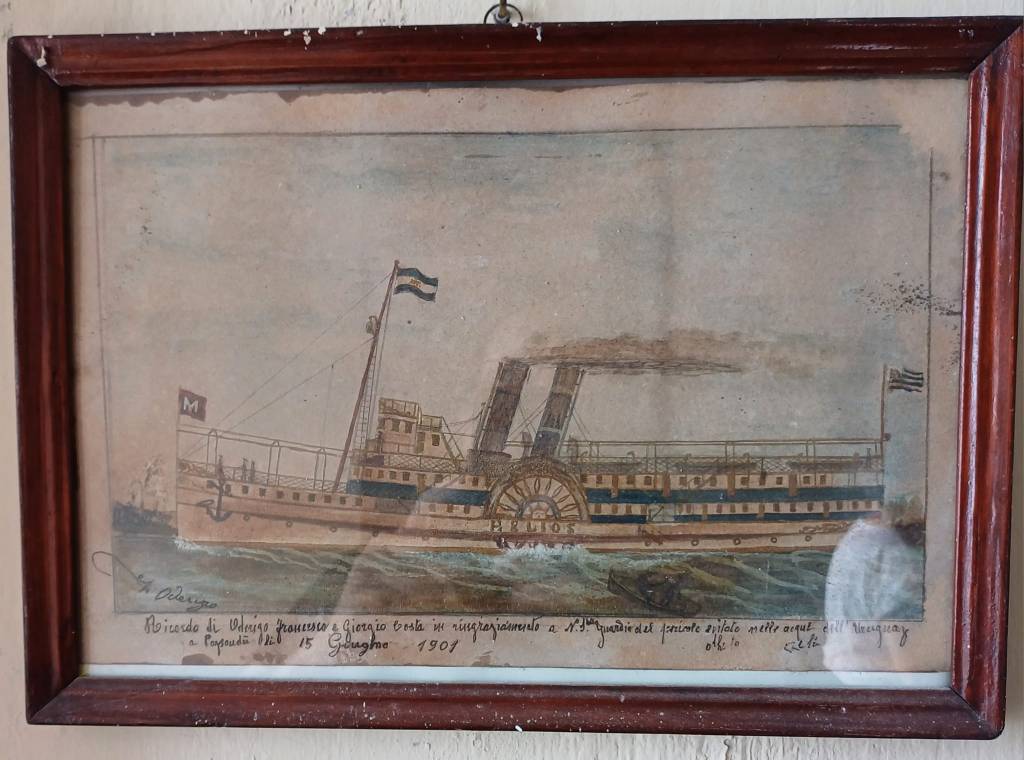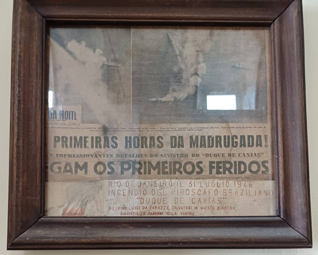 Un articolo di giornale, incorniciato, riferisce dell’incendio di un piroscafo, nel porto di Rio de Janeiro, con i ringraziamenti di un nostro compaesano alla Madonna della Guardia per lo scampato pericolo.