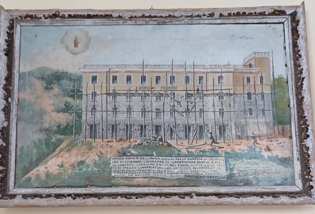 Un quadro posto in alto a sinistra entrando in chiesa, raffigura lo scampato pericolo, capitato ad un muratore, durante la costruzione delle Colonie Milanesi, sopravvissuto ad un volo dal terzo piano.