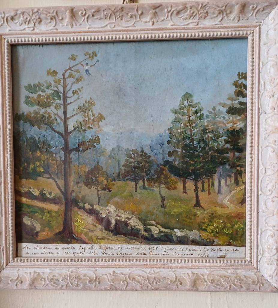 Un bel dipinto, di un’amena radura, forse dirimpettaia au Cian De Gure è il ringraziamento per lo scampato pericolo a seguito di una caduta da un albero di un ragazzo.