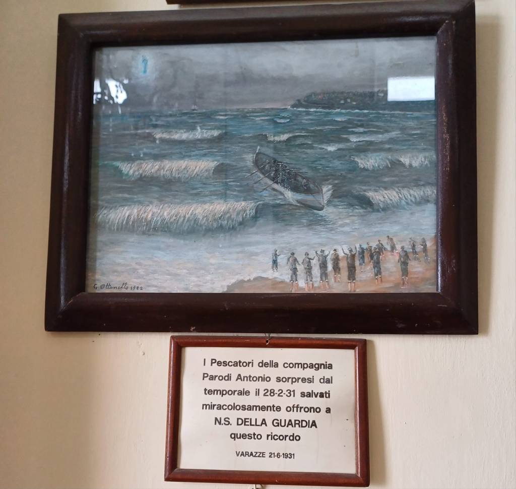 Molti gli ex voto, che riempiono le mura della chiesa, impossibile fare una conta, di chi ha legato uno scampato pericolo o una guarigione, a Nostra Signora della Guardia.