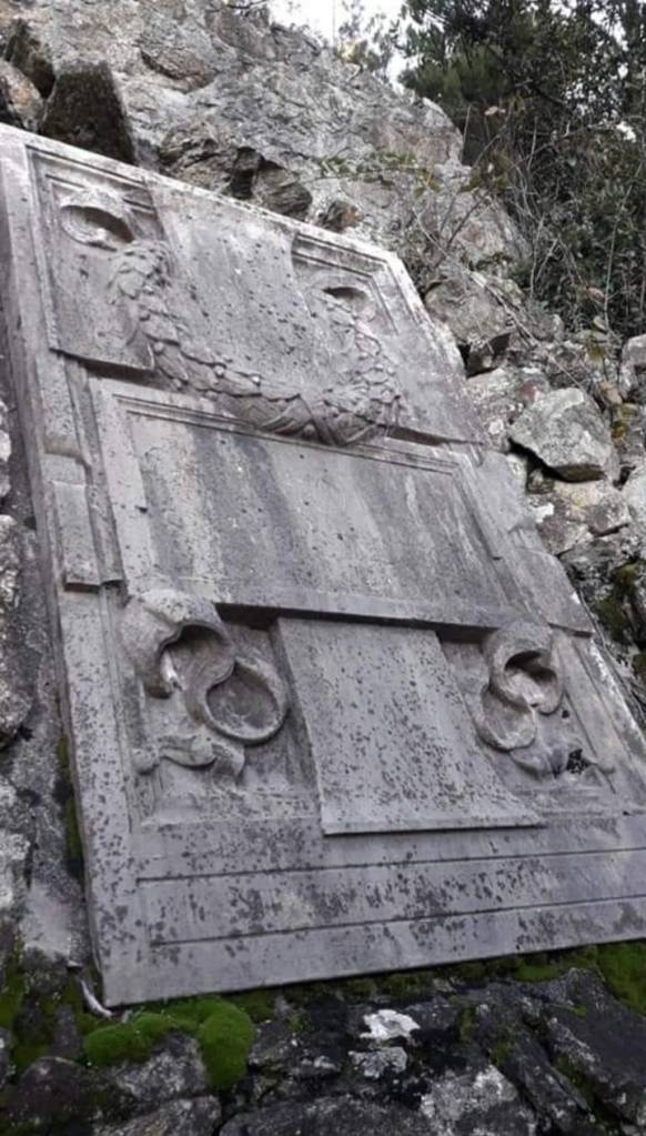Si arriva dopo una curva, al monumento, completamente occluso, alla vista, da un corbezzolo, che ha deciso di radicarsi proprio alla base della lapide.