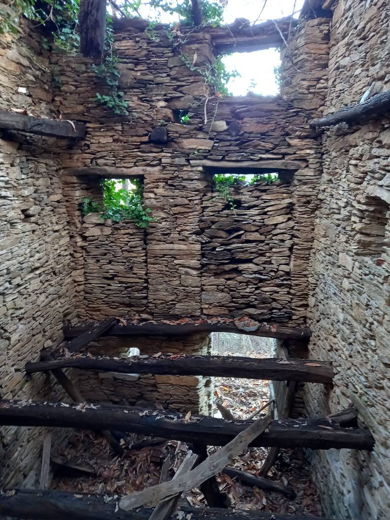 Seguiamo in discesa questo tracciato e arriviamo in una zona terrazzata alla nostra sinistra dove fagocitata dalla vegetazione c ‘è un’altro monumento di pietre.