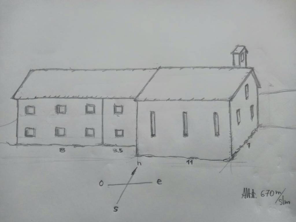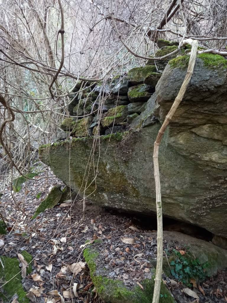 Dopo aver fatto, un ampio giro alla vista di numerosi manufatti, in questa zona a lato da Stra de Lese, Francesco, mi fa notare, in una zona solatia, sopraelevata, a ridosso di una piccola parete rocciosa, le basi di un’edificio diruto, da cui tramite la disposizione delle pietre rimaste se ne può dedurre la pianta. La discreta sezione dei muri di base, depone per un’edificio a un piano.