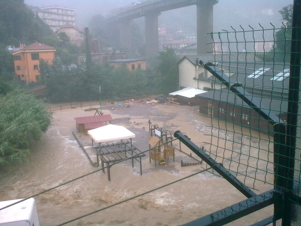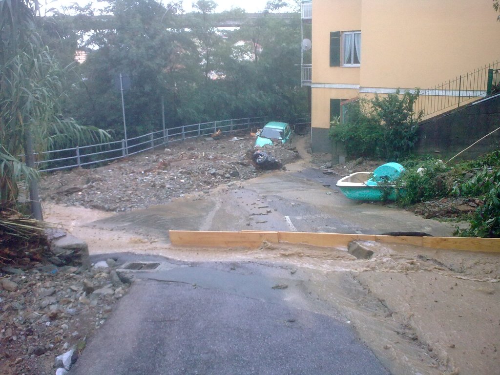 L’ondata d’acqua che stava precipitando, percorse l’alveo del rio Rivà, fino alla tombinatura di via Scavino.